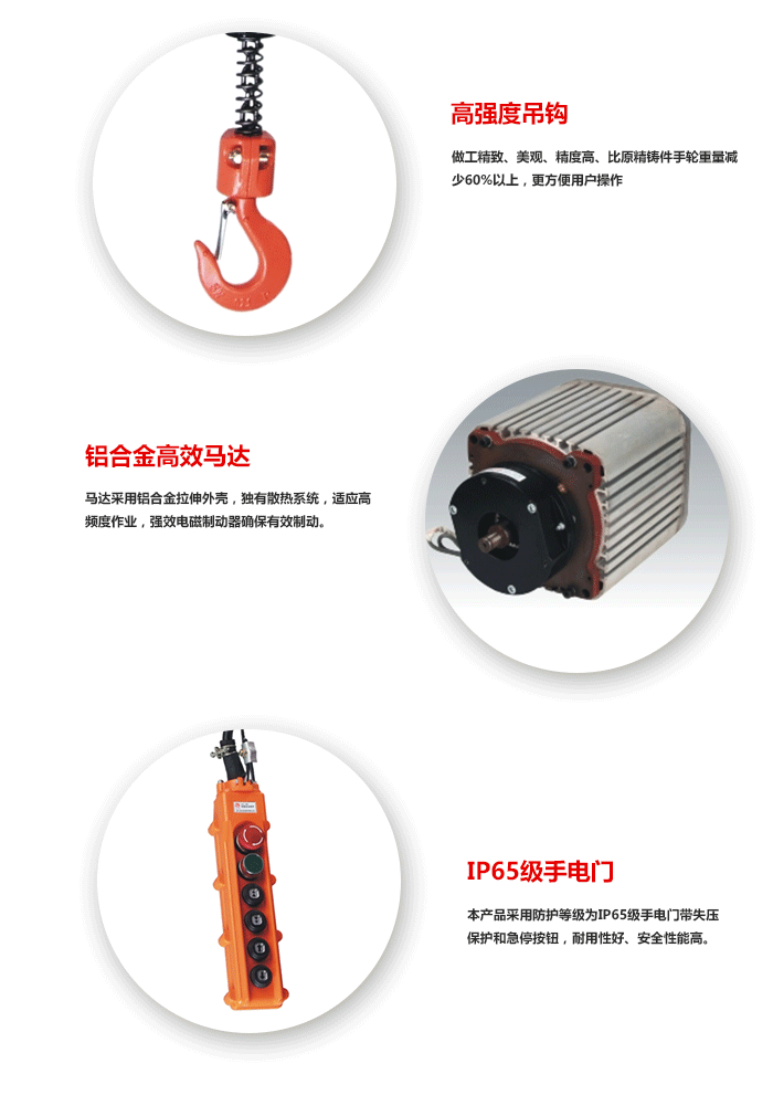 本機設有限載保護裝置,可避免超載時引發(fā)的不良后果;起重吊鉤設有閉鎖裝置,可防止鎖具意外滑脫;電機設有熱保護裝置,當電機因頻繁使用引起溫升過高時,該裝置會自動切斷電機以保護電機不至于被燒壞;本機設有上、下限位裝置,當?shù)蹉^上升或下降至極限位時,本機會自動切斷電源,吊鉤隨即停止動作;本機設有緊急停止按鈕,使操作者于危急狀況是,能立即關閉電源。