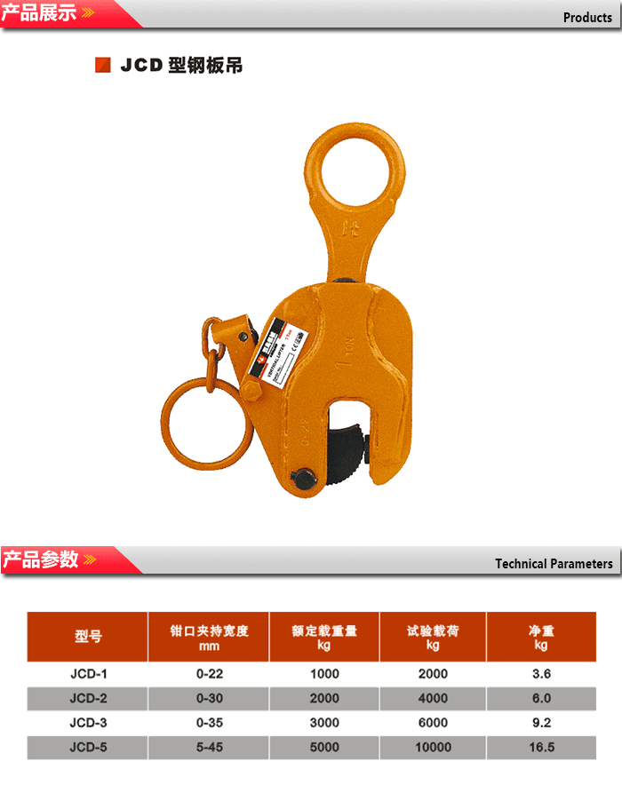 JCD安裝使用方便,外形簡(jiǎn)潔美觀(guān);再夾緊或松開(kāi)時(shí),吊環(huán)做直線(xiàn)移動(dòng)。
